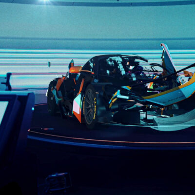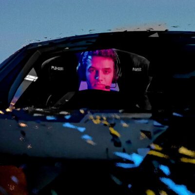 The Logitech playset formed the base structure for Lando to interact with. We devised an idea where he would strap himself into the sim-rig, the music and lights would change, and a 3d McLaren car would build around him and seamlessly integrate into the 3D graphics environment of the game.